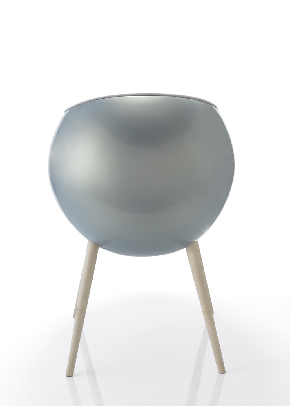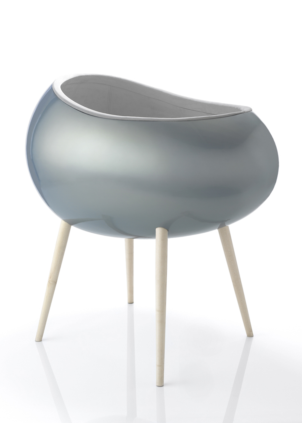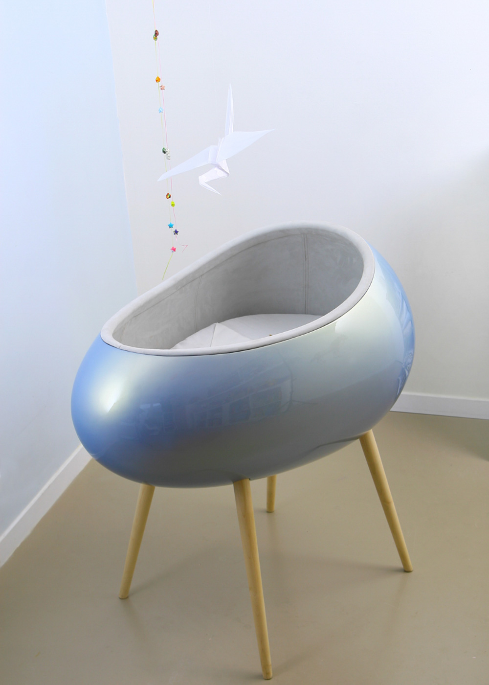 Imaginé comme un œuf, sa coquille ovoïde aux couleurs irisées est inspirée des contours maternels du corps féminin. Ses pieds permettent un bercement spontané, comme un câlin.