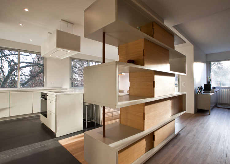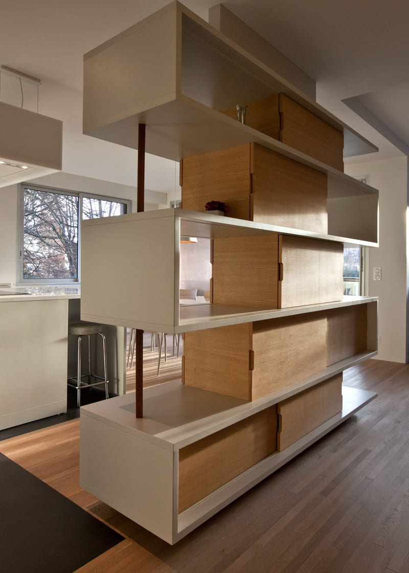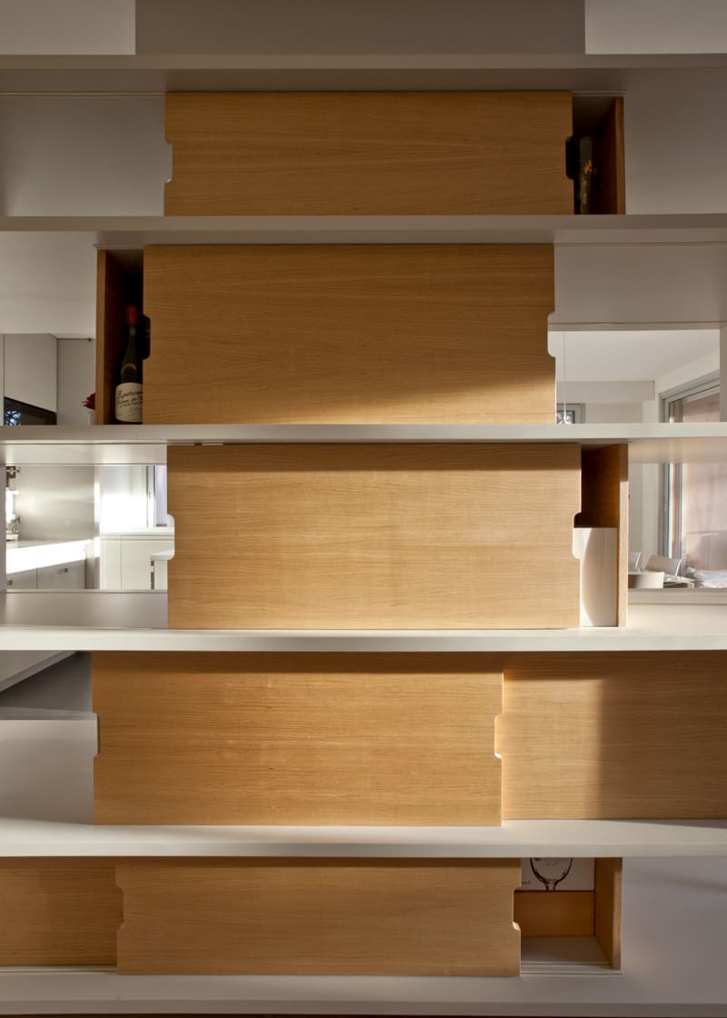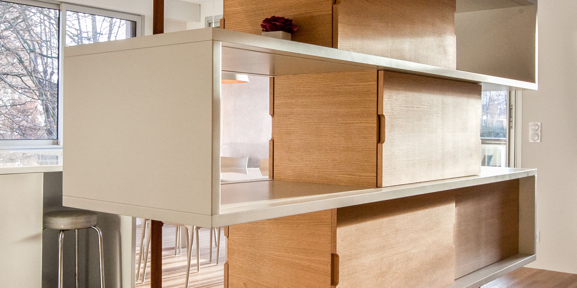 Pour séparer sans isoler, un meuble de rangements compose un jeu graphique de pleins et de vides, au gré de ses coulissants de hêtre, tel un paravent. Ajouré, il offre de nouveaux cadrages sur les espaces qui l’entourent et développent des jeux d’ombres et de lumières, jouent avec les notions du « caché/révélé ».