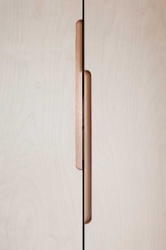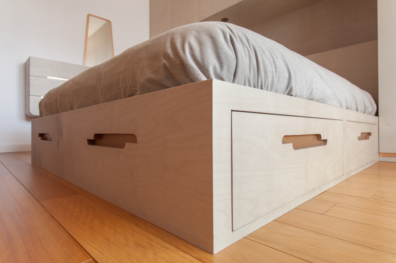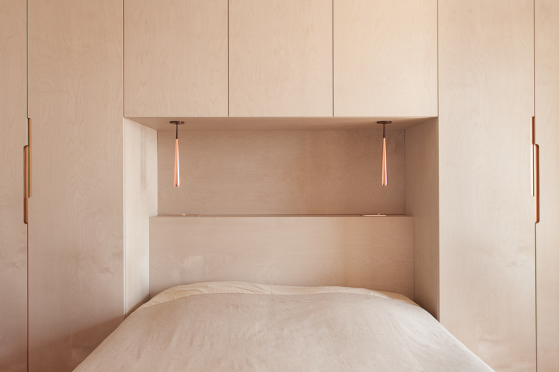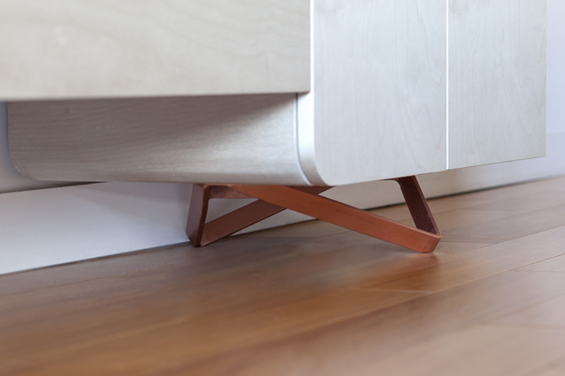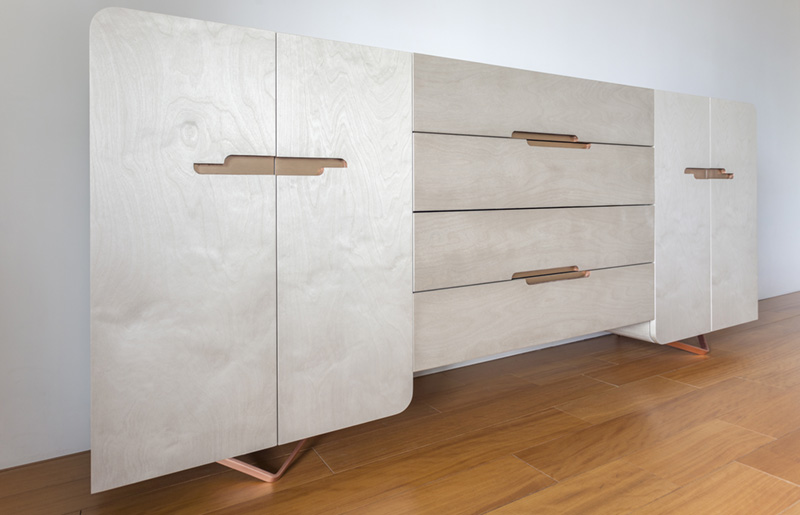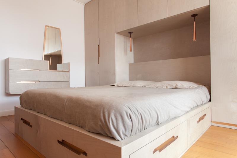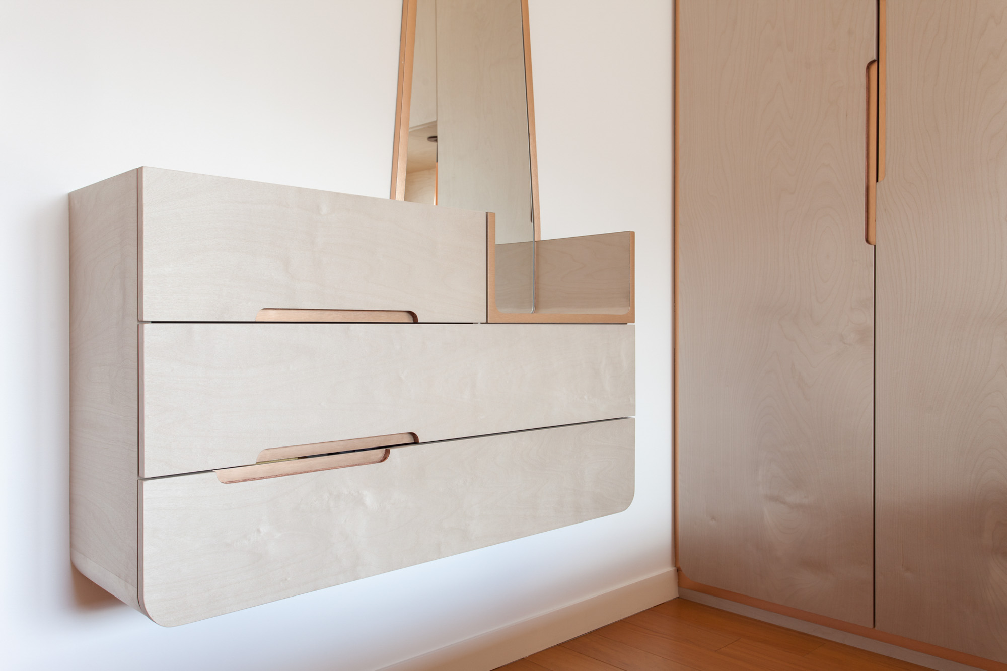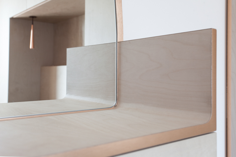 Conçus à partir de 2 matériaux seulement : un contre-plaqué de bouleau (aux nuances ocre-rose) associé aux éclats du cuivre brossé. Destinés à envelopper chaleureusement une chambre parentale (tout en optimisant les rangements), plusieurs volumes habillent le sol et les murs de leurs courbes tout en entretenant un dialogue apaisant et silencieux. Coiffeuse, dressing, sommier et tête de lit, commode et miroir cohabitent dans une recherche d’harmonie et de douceur.