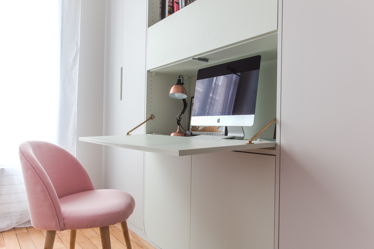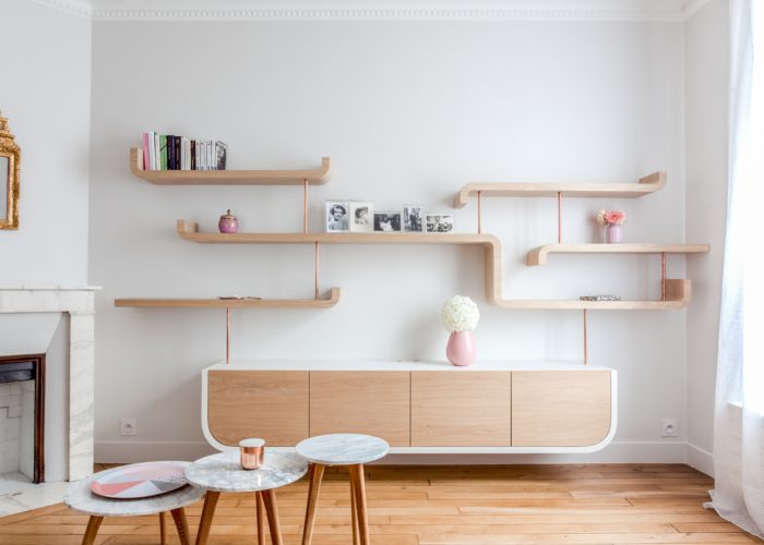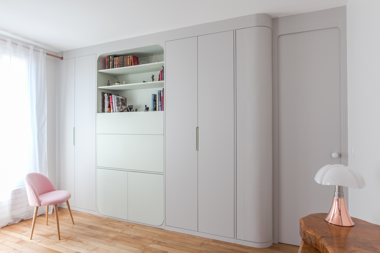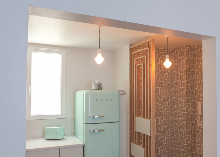 Réaménagement d’un appartement d’une surface de 50m² pour une personne célibataire. La suppression de la totalité des cloisons a permis la création d’un espace de vie central autour duquel le reste de l’appartement s’organise. L’ancien couloir a disparu. Un paravent ajouré sépare, sans isoler, l’entrée de la cuisine. Un grand meuble triple-faces, aux fonctions multiples (rangement / bureau / dressing), délimite discrètement le séjour de la chambre. Une « couchette » semi-ouverte et enveloppée de papier, y revisite le lit à baldaquin. La salle-de-bain attenante s’élargit au profit de nombreux rangements et d’une invisible lingerie.