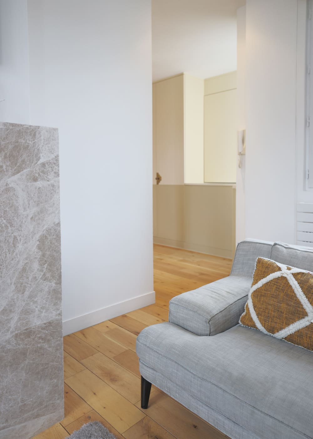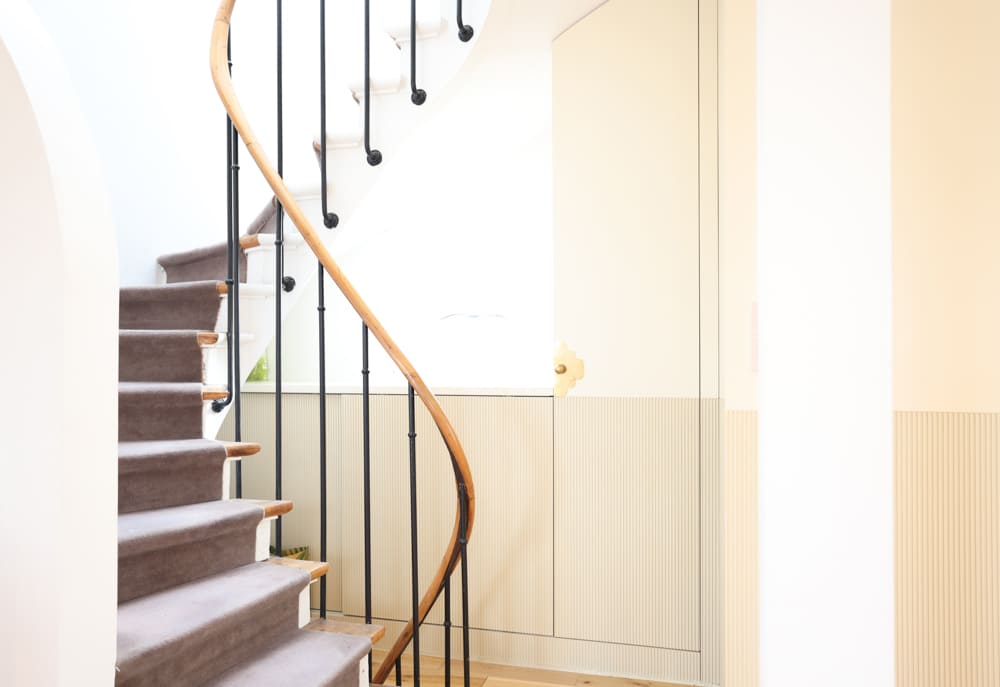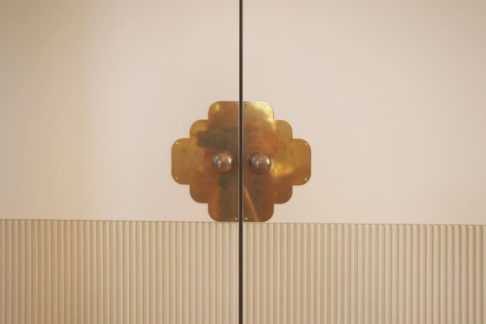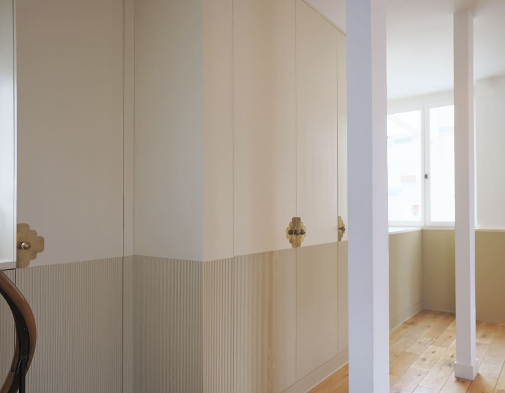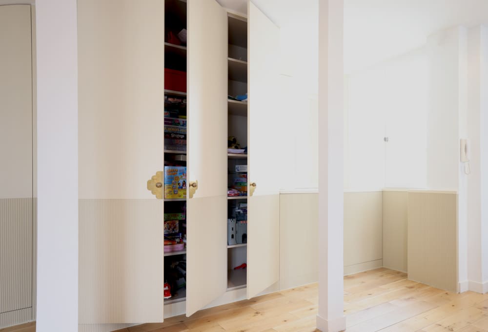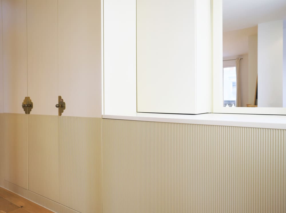 Dans la s-à-m du 1er niveau, un espace avec conception de rangements sur mesure est entièrement repensé tout en distillant une nouvelle note contemporaine et dans l’air du temps. Dans une recherche d’intemporalité, de douceur et de fonctionnalité, les nouveaux agencements dessinés se parent de soubassements cannelés et laqués d’ocre jaune. Leurs poignées en laiton découpées apportent de nouveaux éclats dorés et inattendus, tels des petits bijoux.