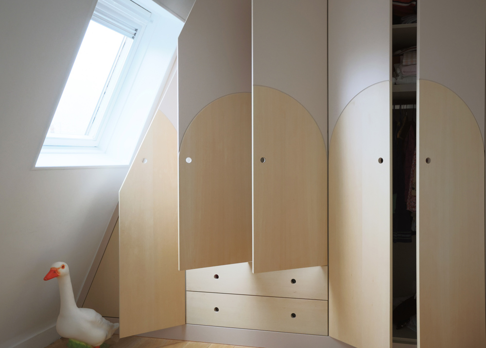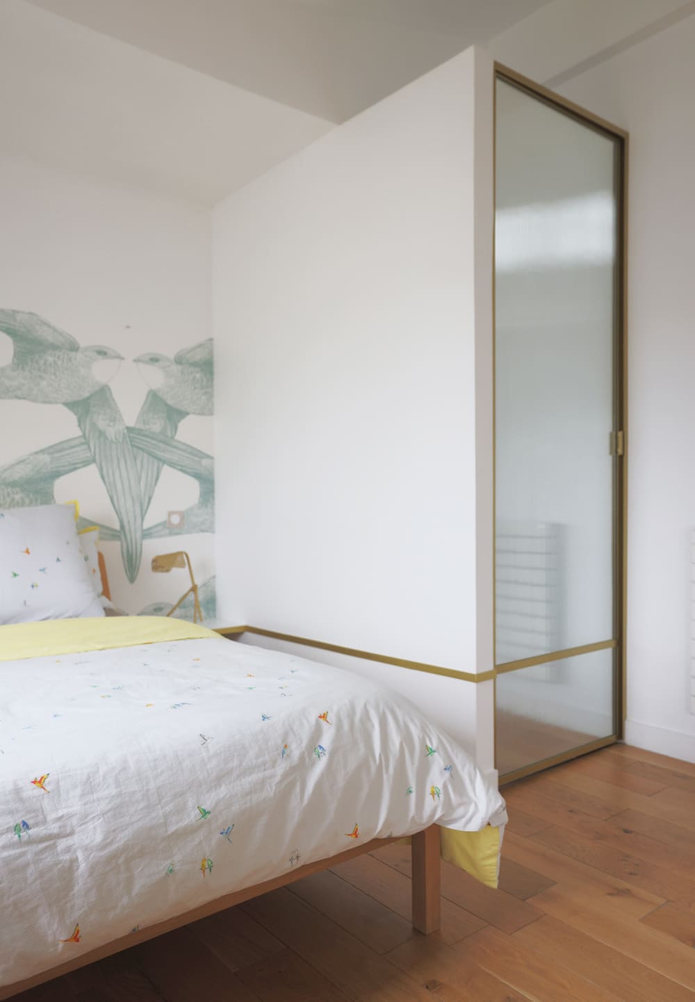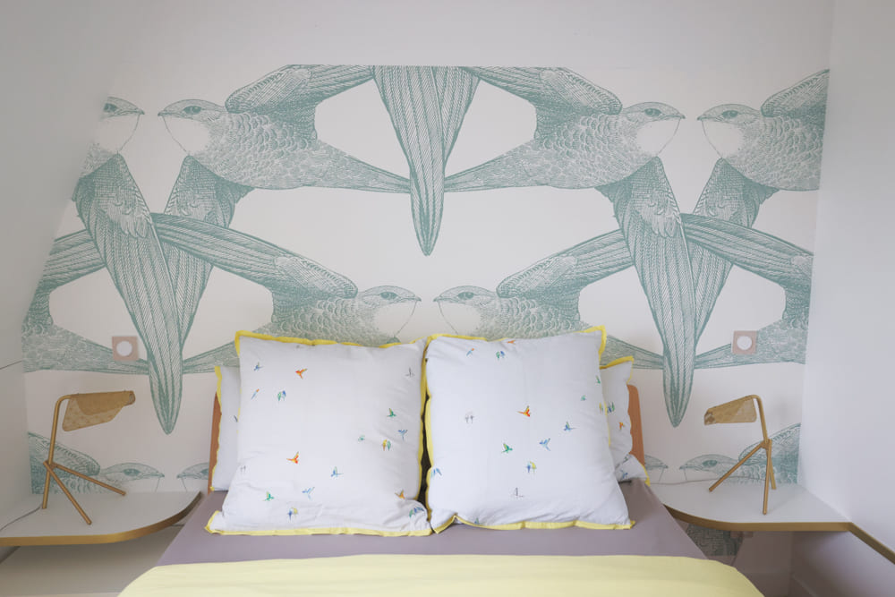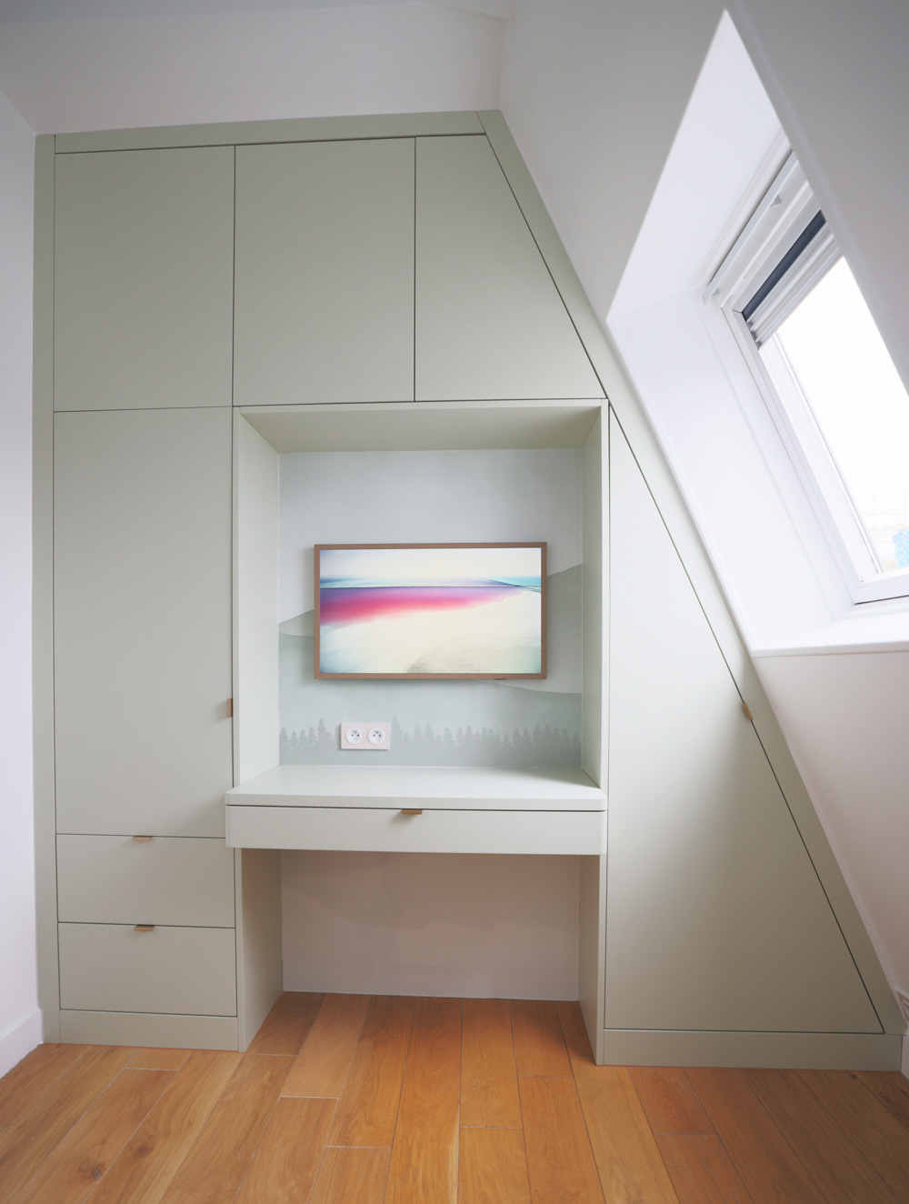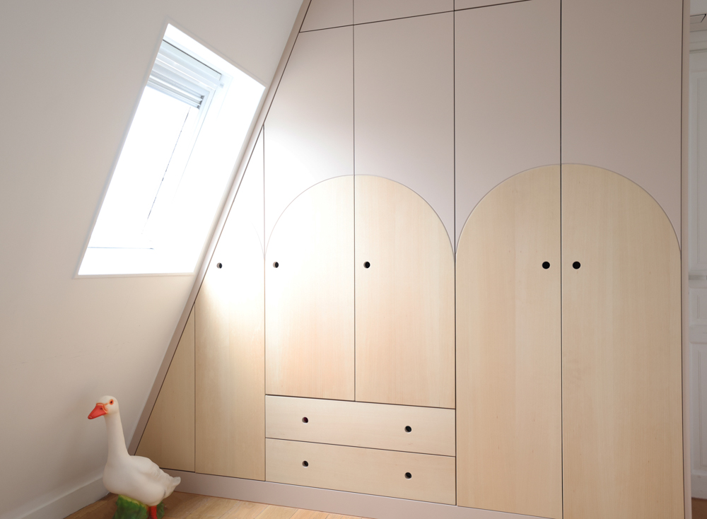 Réaménagement partiel d’un grand appartement familial en duplex situé aux derniers étages d’un immeuble hausmannien du 9ème ar. L’étage sous les toits typique des combles mansardés parisiens (avec son enfilade originelle de petites pièces…) décline 3 grandes chambres déjà réunies mais présentant des proportions hétérogènes et peu équilibrées. L’enjeu du projet de l’étage se tourne alors vers la création de 4 chambres (et non plus 3) spacialement bien équilibrées et dotées de véritables rangements intégrés : les coins et recoins les plus insoupçonnables des chambres sous rampants, se muent alors en rangements sur mesure à foison. L’ameublement insuffle alors à chaque chambre une singularité stylistique clairement assumée : la chambre parentale s’offre un nouveau dressing épuré et de couleur tendre twisté par une envolée d’oiseaux en tête de lit et soulignée de lisérés dorés, la chambre de la petite fille s’offre de nouveaux horizons paysagers et des arches de bouleau à ses façades de dressing rose poudré…