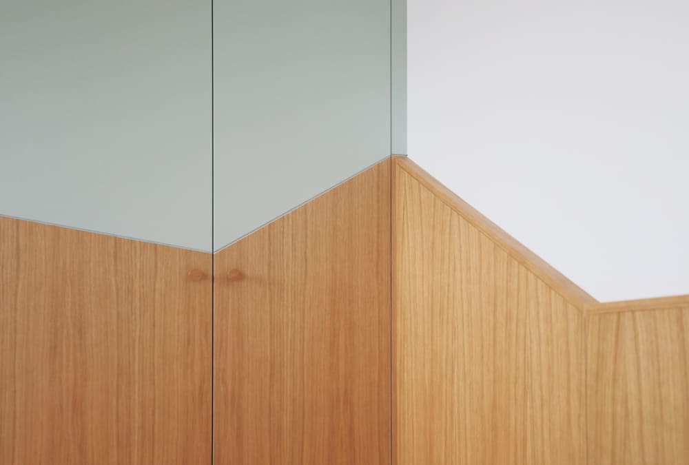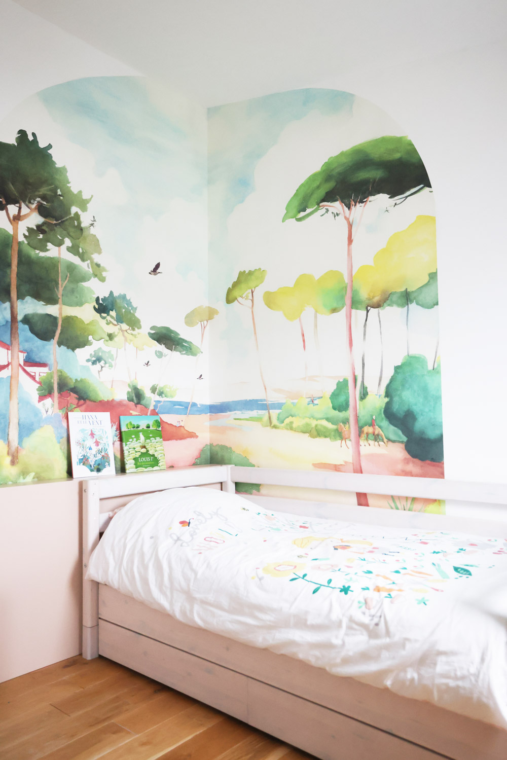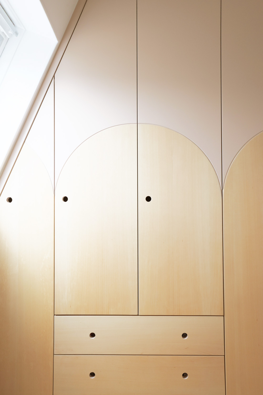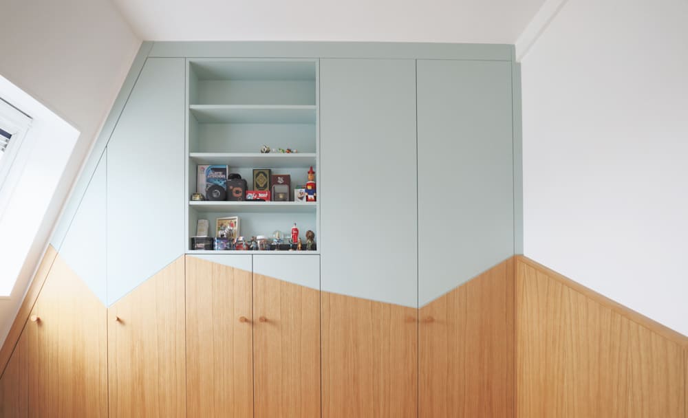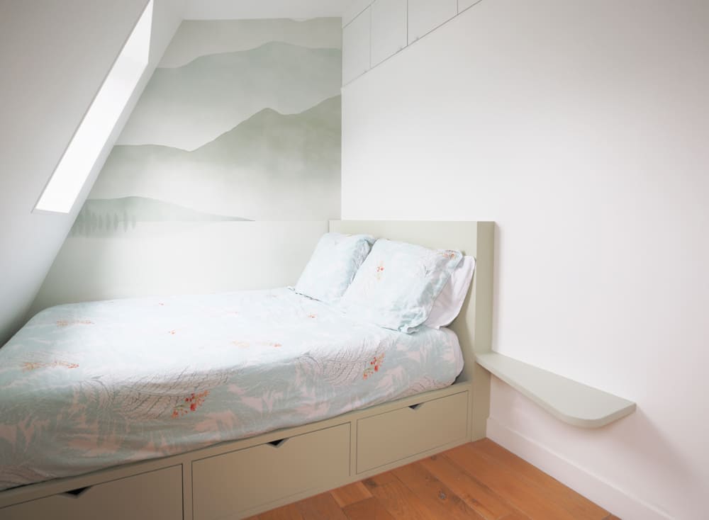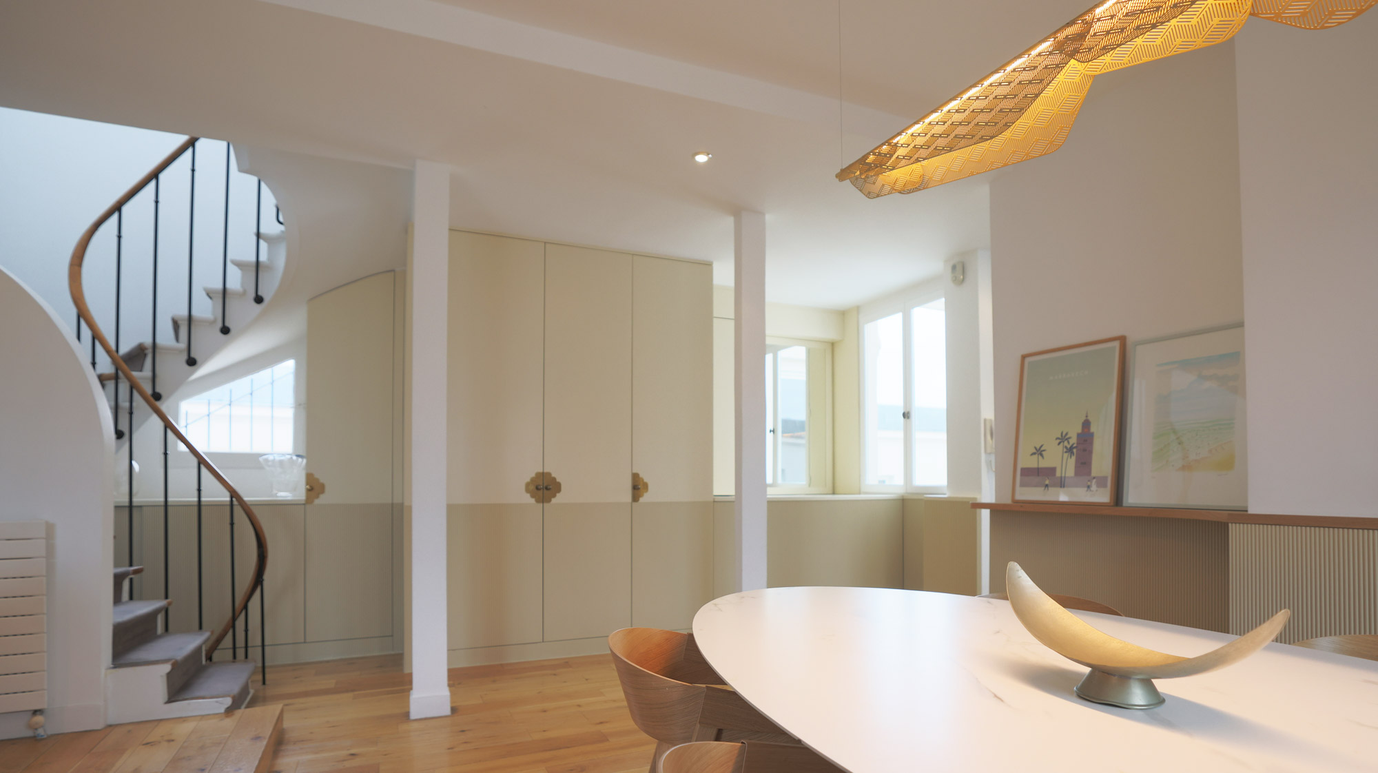 Réaménagement partiel d’un grand appartement familial en duplex situé aux derniers étages d’un immeuble hausmannien du 9ème ar. L’étage sous les toits typique des combles mansardés parisiens (avec son enfilade originelle de petites pièces…) décline 3 grandes chambres déjà réunies mais présentant des proportions hétérogènes et peu équilibrées. L’enjeu du projet de l’étage se tourne alors vers la création de 4 chambres (et non plus 3) spacialement bien équilibrées et dotées de véritables rangements intégrés : les coins et recoins les plus insoupçonnables des chambres sous rampants, se muent alors en rangements sur mesure à foison. L’ameublement insuffle alors à chaque chambre une singularité stylistique clairement assumée : la chambre parentale s’offre un nouveau dressing épuré et de couleur tendre twisté par une envolée d’oiseaux en tête de lit et soulignée de lisérés dorés, la chambre de la petite fille s’offre de nouveaux horizons paysagers et des arches de bouleau à ses façades de dressing rose poudré…