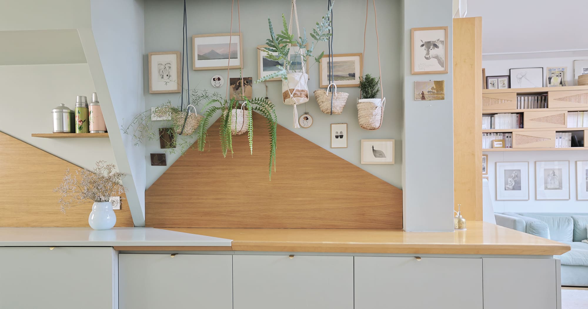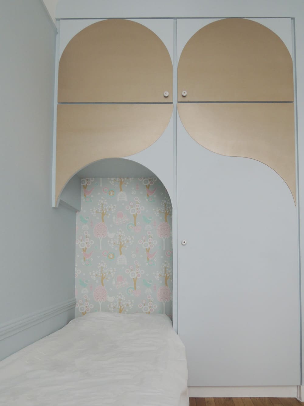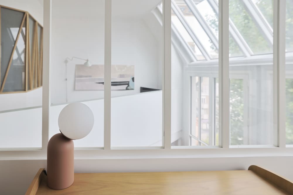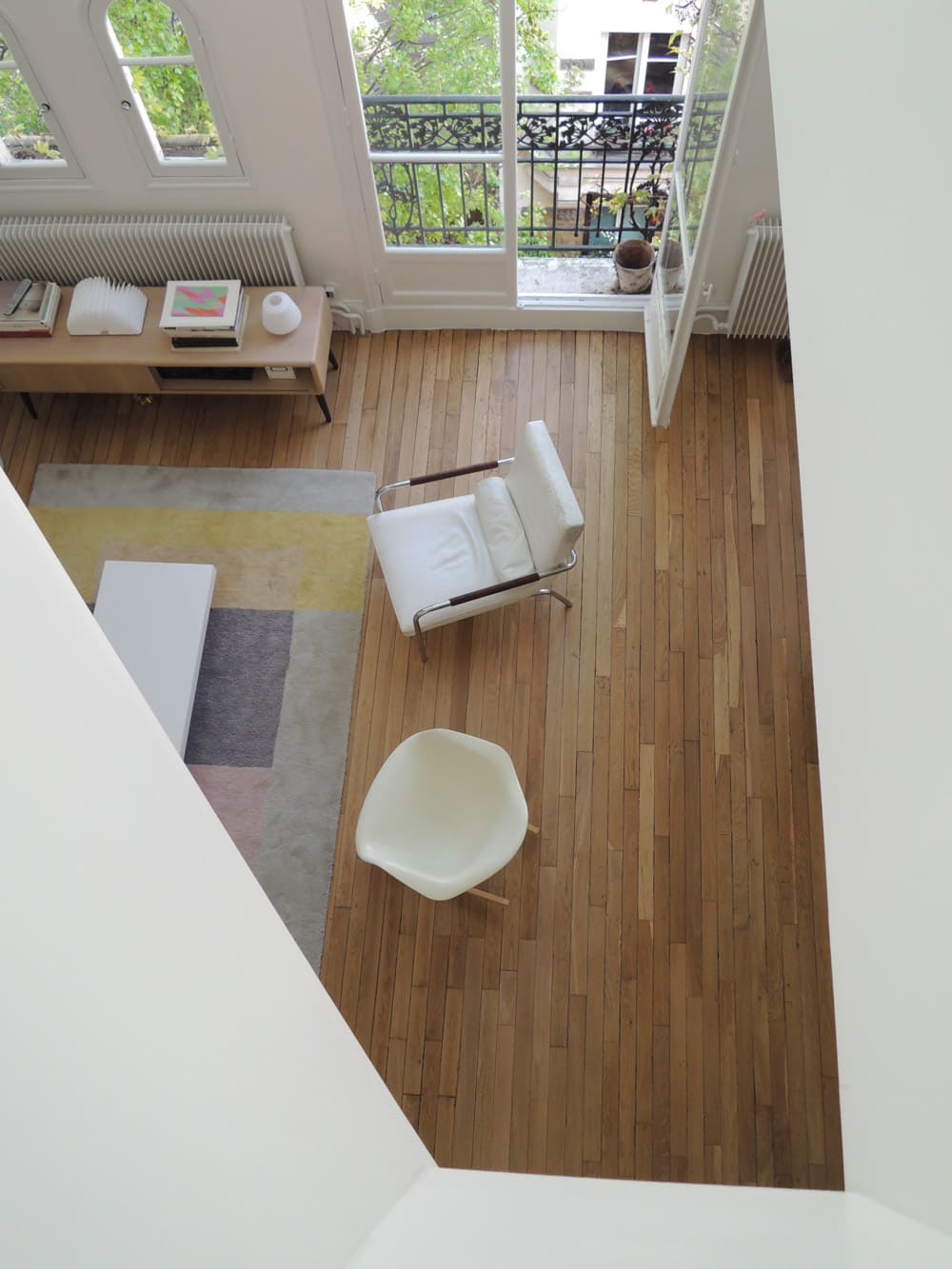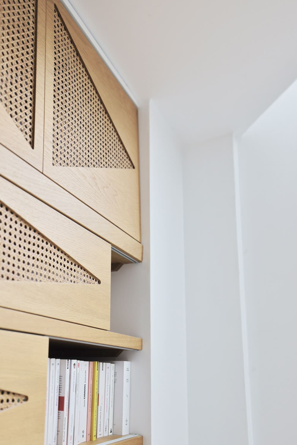 Rénovation complète d’un ancien atelier d’artiste parisien en duplex situé au cœur du 14ème ar. de Paris. Conçu par l’architecte Paul Schroeder en 1912, cet ancien atelier niché aux 2 derniers étages de l’immeuble, bénéficie d’un charme fou : son espace de vie central à l’exceptionnelle hauteur sous plafond (6m) est baigné d’une lumière zénithale constante et homogène. Les verrières du Nord plongent ses habitants dans un ciel en perpétuel mouvement mais aussi dans les feuillages des 2 grands peupliers de la cour intérieure. Au cœur de l’appartement, les espaces de vie sont ouverts les uns aux autres tout en proposant des agencements sur mesure aux multiples rangements. Le plan de travail en corian de la cuisine vient à la rencontre d’un plan en bois tel un puzzle. Une bibliothèque en chêne semi-ajourée par des panneaux coulissants en cannage joue du motif triangulaire et oblique flottants juste au-dessus par la présence d’une mezzanine au plan triangulaire. La chambre parentale redistribue son dressing tout en lui intégrant une nouvelle et invisible salle d’eau. A l’étage, telle une maison perchée, les chambres des enfants se répartissent côté Sud et côté Nord, exploitant ainsi une 2de mezzanine largement vitrée pour y accueillir le dernier né de la famille agrandie. Le projet devient ainsi une formidable occasion d’offrir à ces lieux chargés d’histoire un nouveau bain de jouvence.