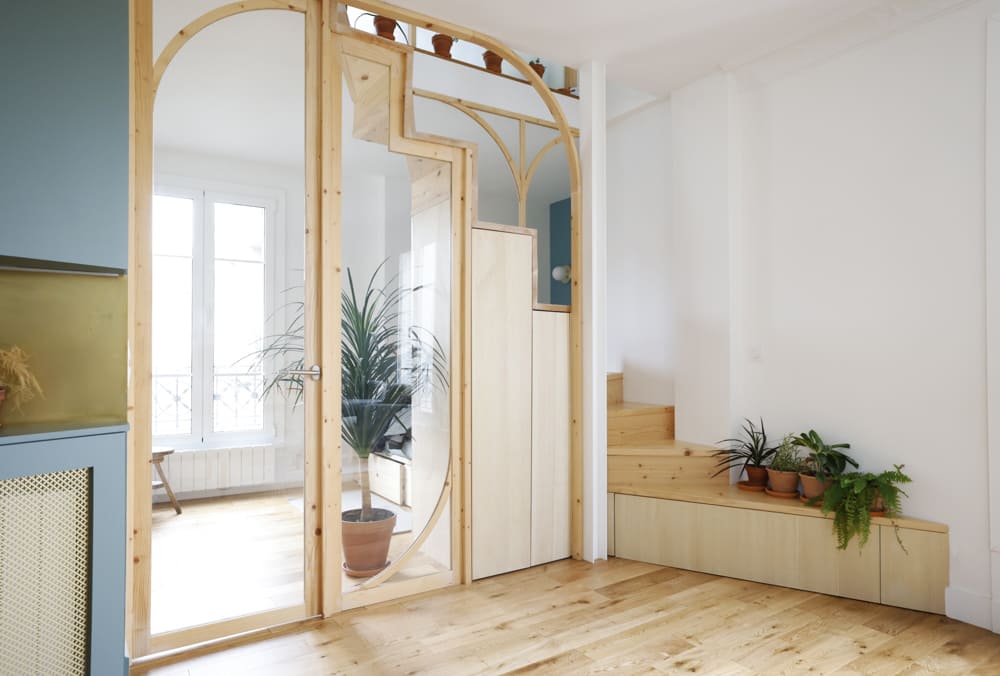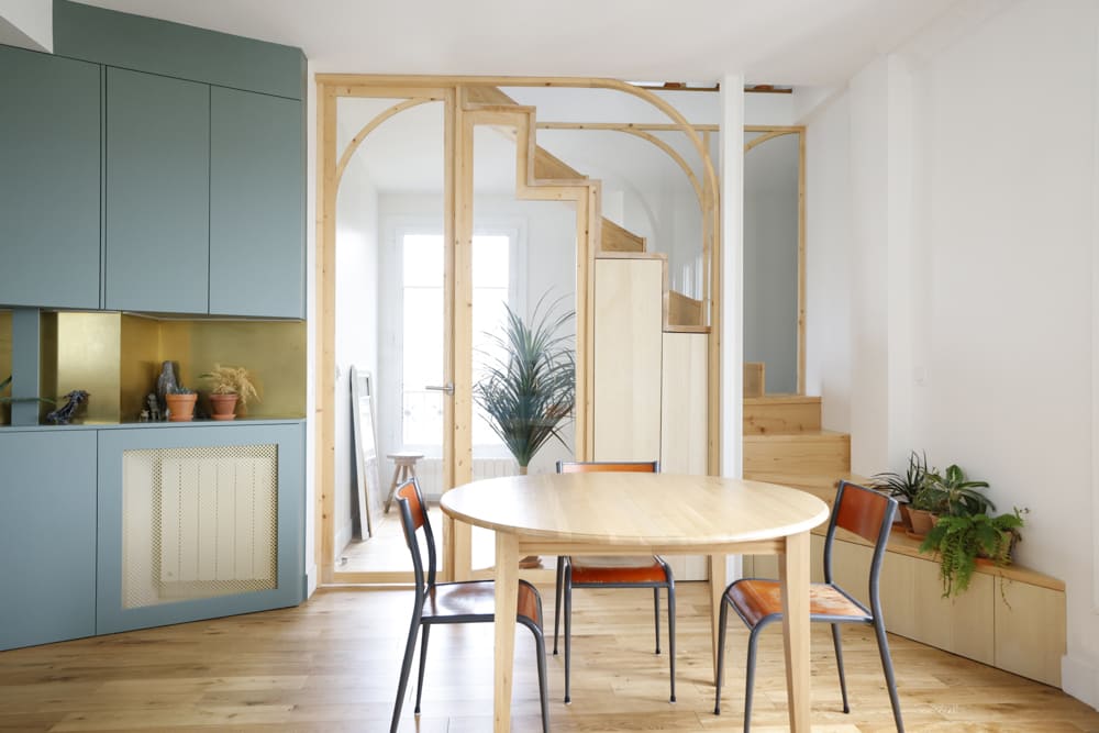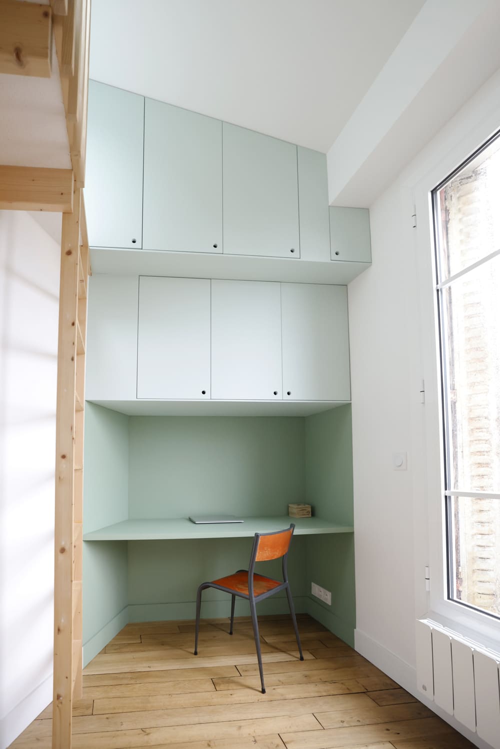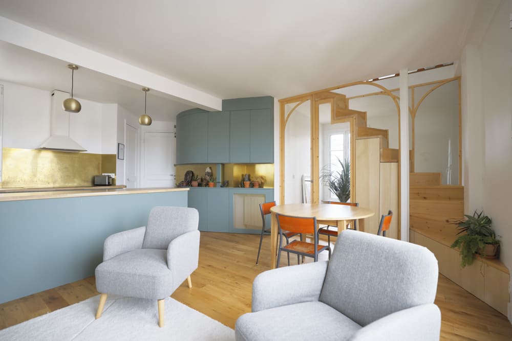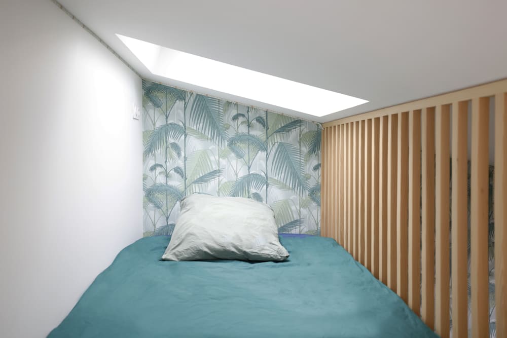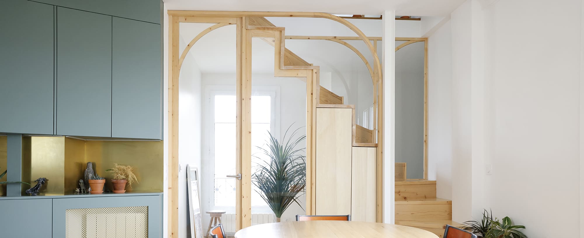 Rénovation et restructuration complète d’un appartement de 74 m² situé aux derniers étages d’un immeuble des années 1920 à Paris 12ème. Pour ce projet complexe, en duplex, aux petites pièces à l’origine commandées et très cloisonnées, il a fallu tout revoir, du sol au plafond : ouvrir les espaces de vie, consolider les structures parfois très altérées, concevoir un escalier sur mesure compact (à pas japonais) tout en délimitant une chambre parentale et en favorisant la circulation de la lumière naturelle mais aussi en recevant un maximum de rangements intégrés. La façade entièrement vitrée de la chambre et le garde-corps des escaliers aux arrondis graphiques et minimalistes deviennent un élément architectural à part entière et un lien naturel entre les 2 niveaux. Dans le séjour aux tonalités vert foncé, l’entrée, la cuisine, le salon et la salle-à-manger cohabitent et se transforment en une pièce de vie conviviale. A l’étage des enfants, de nouvelles « chambres-cabanes » sont composées pour exploiter toute la hauteur des combles autrefois non-aménagés et offrir un maximum de rangements sur mesure. Comme dans les contes pour enfants, des lits sous les toits sont créés, subtilement dissimulés par des claustras de bois, pour libérer un maximum d’espace en partie basse et au profit également d’un nouveau couloir desservant les chambres et innondé de lumière naturelle.