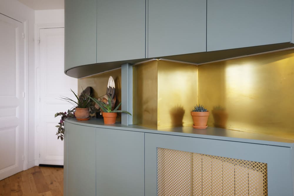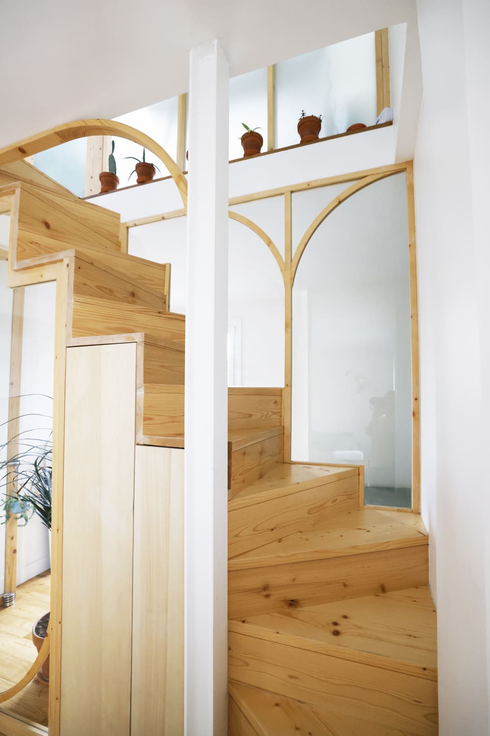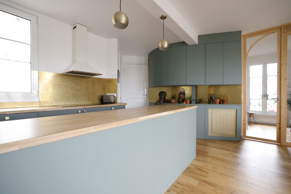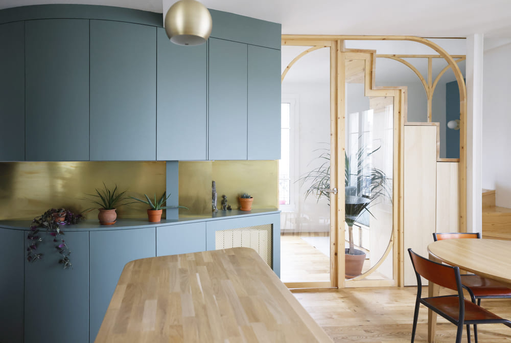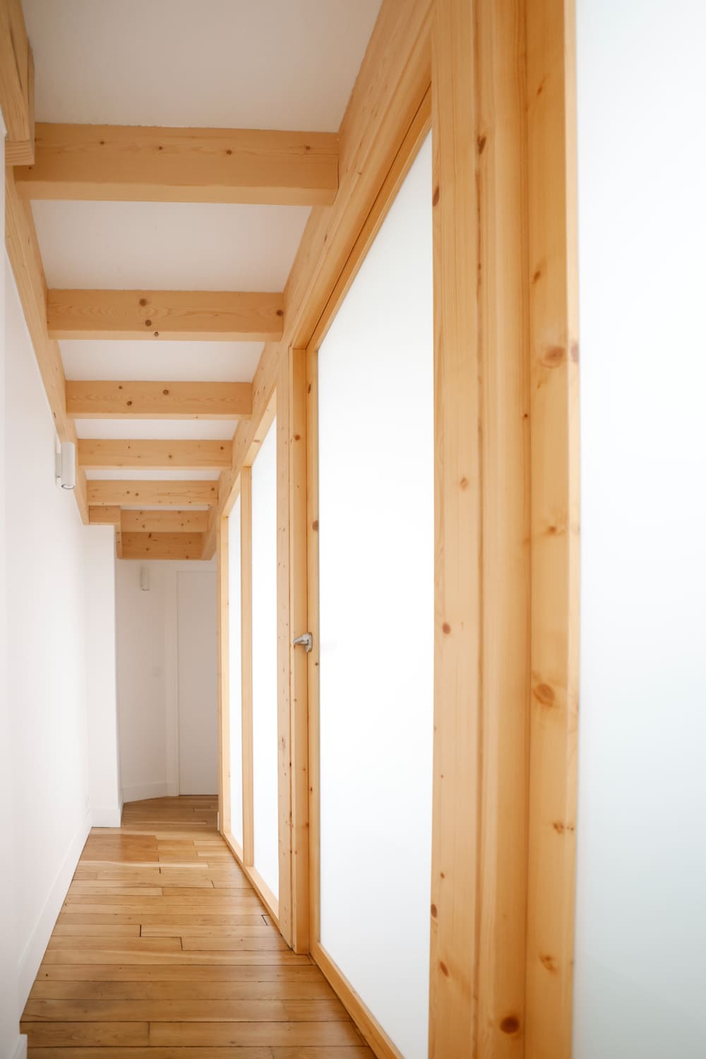 Rénovation et restructuration complète d’un appartement de 74 m² situé aux derniers étages d’un immeuble des années 1920 à Paris 12ème. Pour ce projet complexe, en duplex, aux petites pièces à l’origine commandées et très cloisonnées, il a fallu tout revoir, du sol au plafond : ouvrir les espaces de vie, consolider les structures parfois très altérées, concevoir un escalier sur mesure compact (à pas japonais) tout en délimitant une chambre parentale et en favorisant la circulation de la lumière naturelle mais aussi en recevant un maximum de rangements intégrés. La façade entièrement vitrée de la chambre et le garde-corps des escaliers aux arrondis graphiques et minimalistes deviennent un élément architectural à part entière et un lien naturel entre les 2 niveaux. Dans le séjour aux tonalités vert foncé, l’entrée, la cuisine, le salon et la salle-à-manger cohabitent et se transforment en une pièce de vie conviviale. A l’étage des enfants, de nouvelles « chambres-cabanes » sont composées pour exploiter toute la hauteur des combles autrefois non-aménagés et offrir un maximum de rangements sur mesure. Comme dans les contes pour enfants, des lits sous les toits sont créés, subtilement dissimulés par des claustras de bois, pour libérer un maximum d’espace en partie basse et au profit également d’un nouveau couloir desservant les chambres et innondé de lumière naturelle.