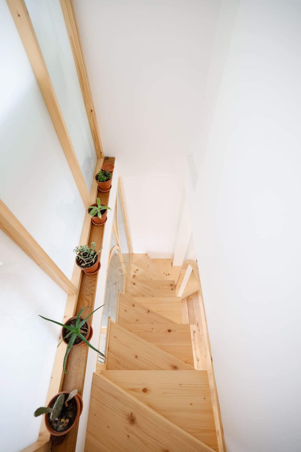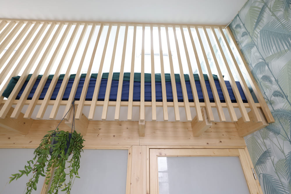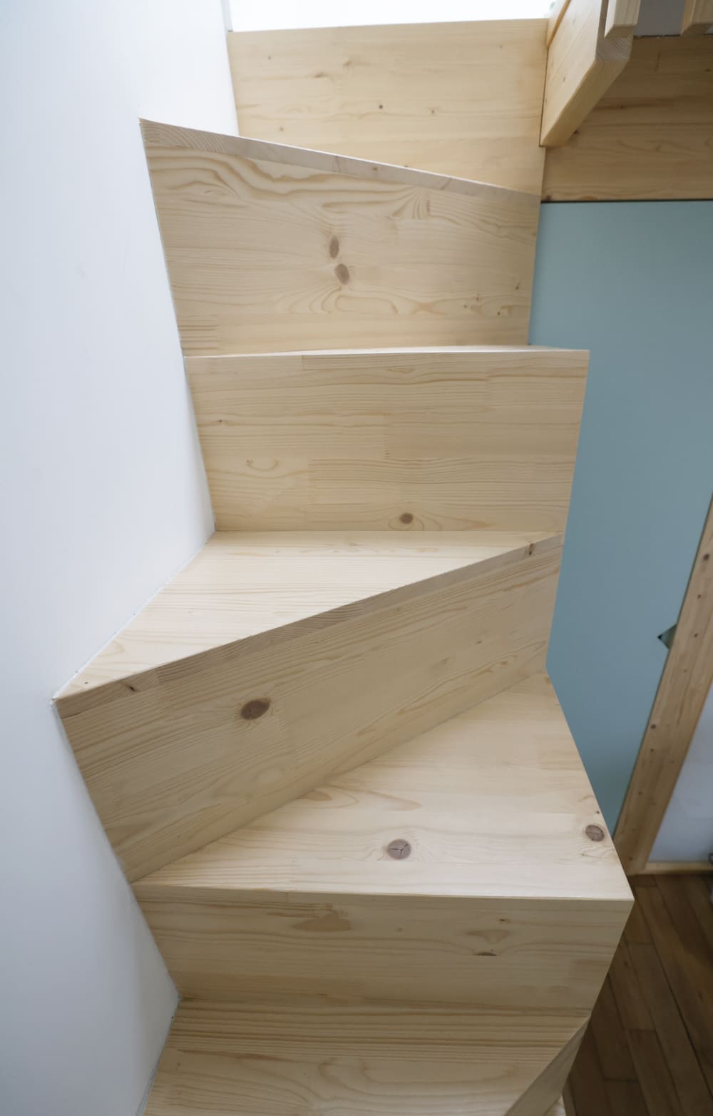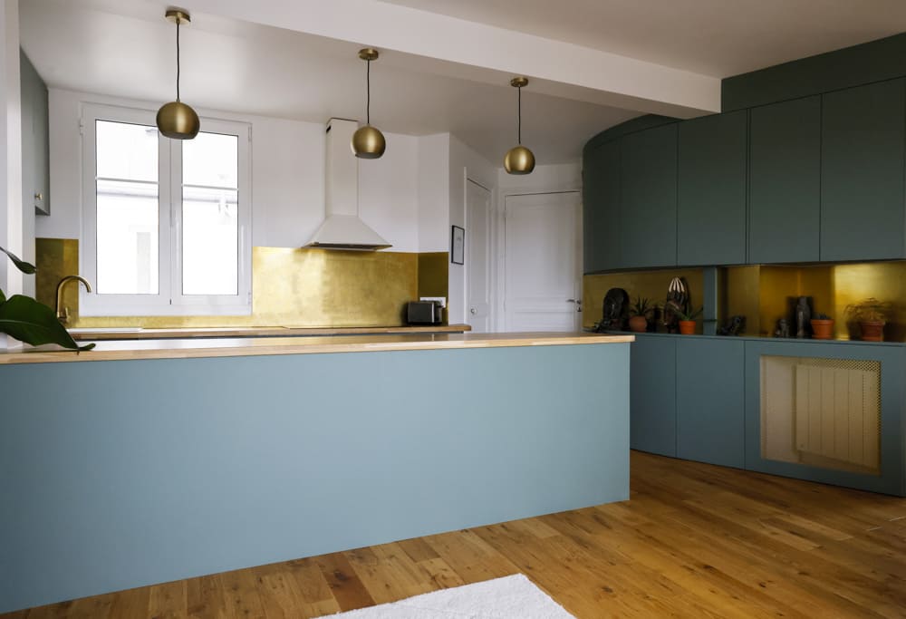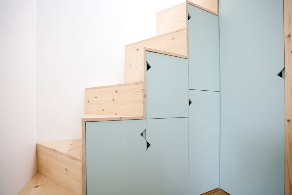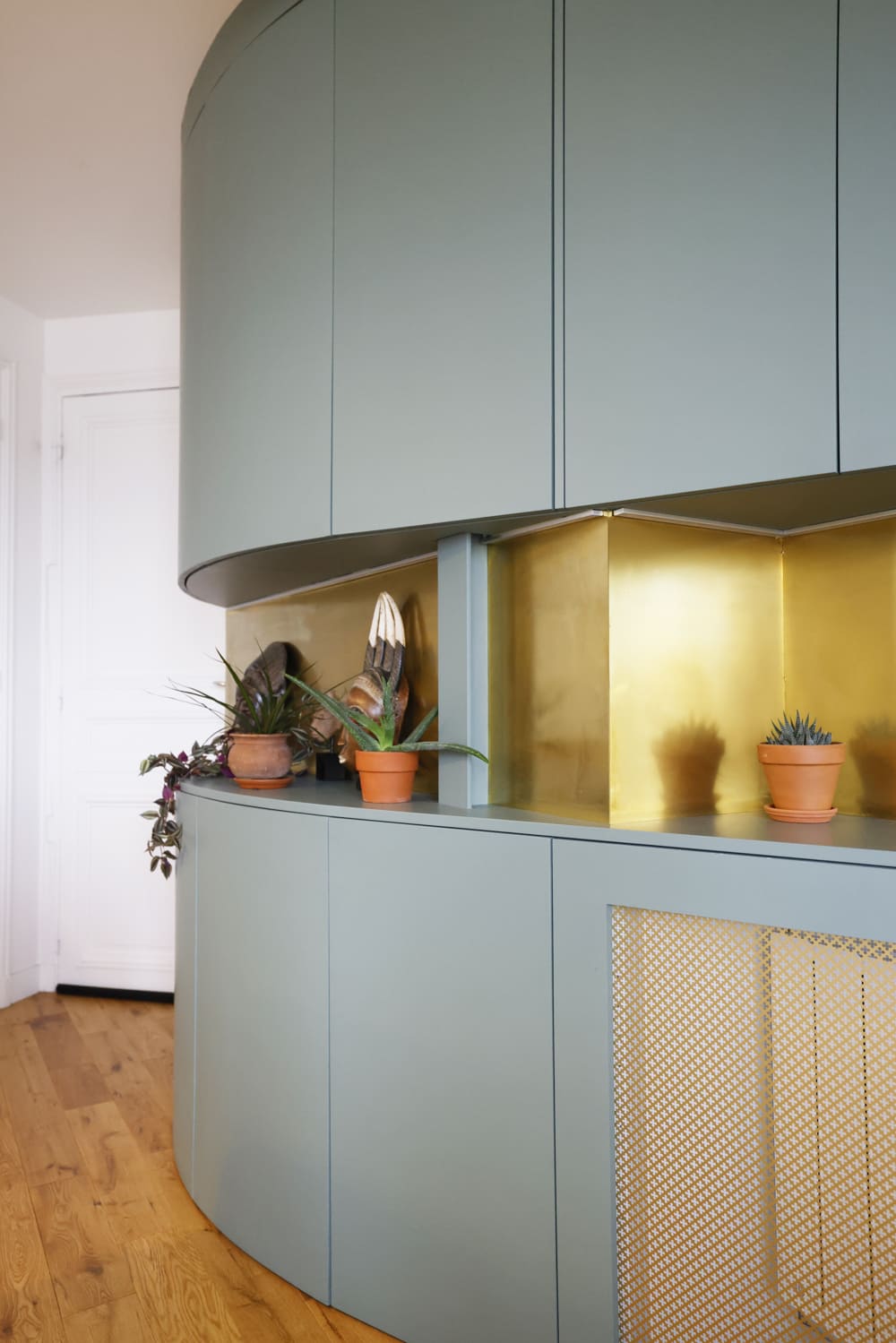 Rénovation et restructuration complète d’un appartement de 74 m² situé aux derniers étages d’un immeuble des années 1920 à Paris 12ème. Pour ce projet complexe, en duplex, aux petites pièces à l’origine commandées et très cloisonnées, il a fallu tout revoir, du sol au plafond : ouvrir les espaces de vie, consolider les structures parfois très altérées, concevoir un escalier sur mesure compact (à pas japonais) tout en délimitant une chambre parentale et en favorisant la circulation de la lumière naturelle mais aussi en recevant un maximum de rangements intégrés. La façade entièrement vitrée de la chambre et le garde-corps des escaliers aux arrondis graphiques et minimalistes deviennent un élément architectural à part entière et un lien naturel entre les 2 niveaux. Dans le séjour aux tonalités vert foncé, l’entrée, la cuisine, le salon et la salle-à-manger cohabitent et se transforment en une pièce de vie conviviale. A l’étage des enfants, de nouvelles « chambres-cabanes » sont composées pour exploiter toute la hauteur des combles autrefois non-aménagés et offrir un maximum de rangements sur mesure. Comme dans les contes pour enfants, des lits sous les toits sont créés, subtilement dissimulés par des claustras de bois, pour libérer un maximum d’espace en partie basse et au profit également d’un nouveau couloir desservant les chambres et innondé de lumière naturelle.